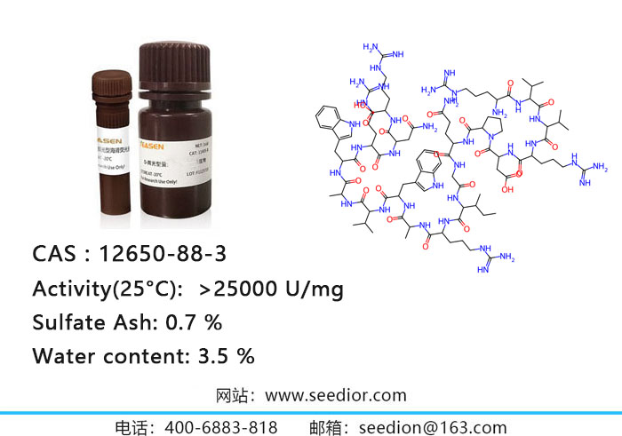 产品编号: SR-L6051 CAS 号: 12650-88-3 纯度: ≥25000 units/mg 酶活性,来源于鸡蛋清,白色结晶粉末。对热稳定性较高,最适合pH值为6.5,在酸性条件下(pH 4-5)能长时间耐热而不失活,但在碱性环境中活性则快速下降。【研究与应用方向】:抗感染药物、创伤愈合剂、粘膜类炎症药物研发和原料; 提取细菌内部生物分子,利用其与目标分子的相互作用下进行亲和色谱纯化; 作为研究蛋白质结构和功能的模式分子;在免疫学和微生物学中研究先天免疫机制,它还作为牙膏和漱口水功能添加剂。