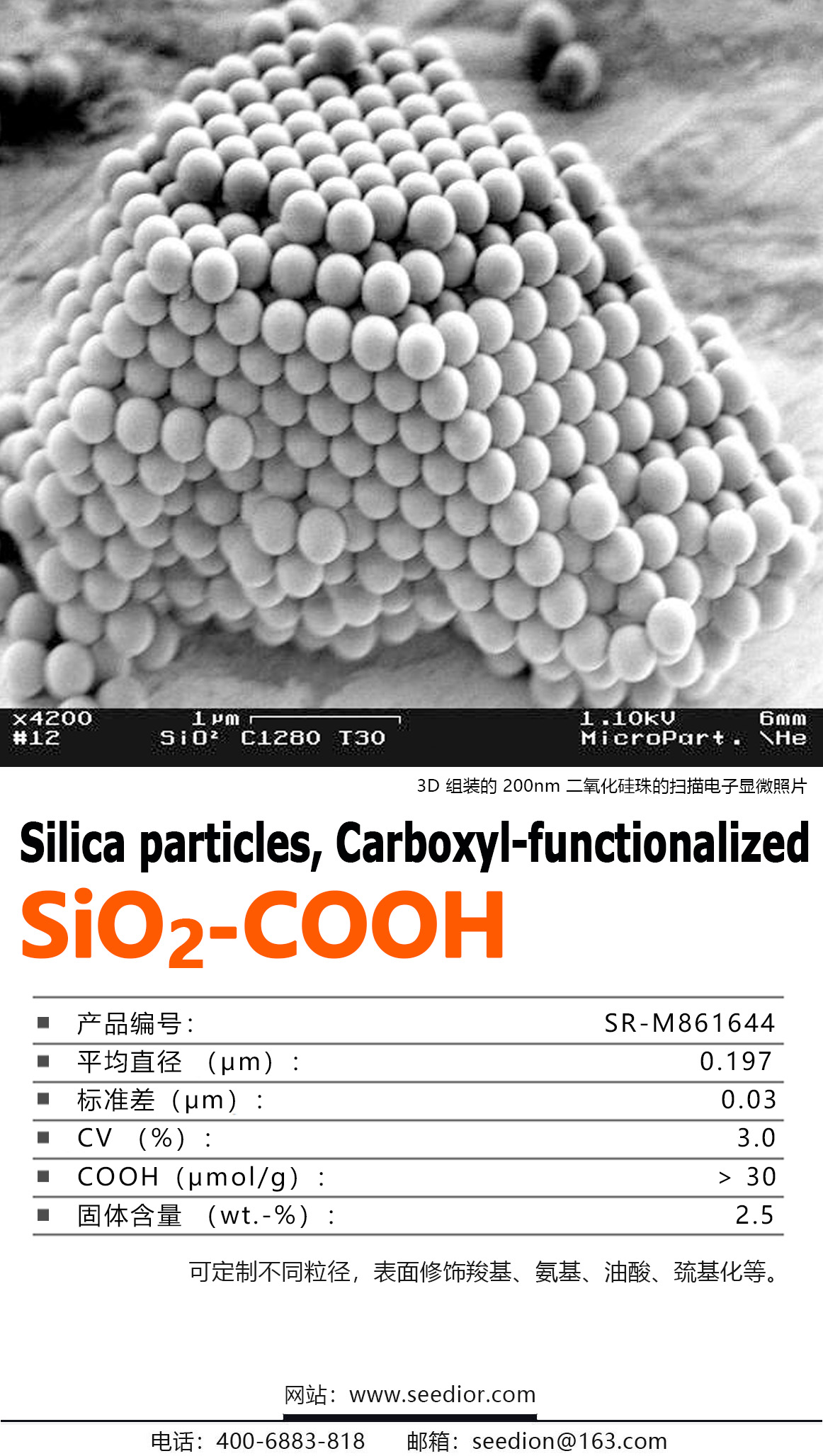 纯度: 2.5% w/v 分散液 ; 溶胶-凝胶法制备。由致密非晶态二氧化硅构成,密度:~2 g/cm3,机械强度高; 折光指数:~1.43; 严格正球形数字品控、表面光滑、尺寸高度均一: CV 值 ≤3%。羧基官能团:表面通过化学修饰共价连接羧基,使其易于通过碳二亚胺偶联等方法与氨基修饰的分子进行共价连接,表面带负电,Zeta电位受pH值影响。 【研究与应用方向】:1. 生物医学检测与诊断:免疫层析、彩色或荧光标记物载体、羧基共价连接抗体,均相免疫分析,表面羧基固定蛋白质、核酸等生物分子,用于高灵敏度的生物传感器。2.标准与计量材料: 电子显微镜校准,粒度仪校准,胶体体系模型粒子。3.功能结构材料: