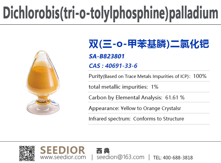 Bis(triphenylphosphine)palladium(II) dichloride二三苯基膦二氯化钯 | 双三苯基磷二氯化钯 | 双(三苯基膦)二氯化钯(Ⅱ)CAS 号: 13965-03-2 ; 外观:黄色粉末 应用范围: 主要用于Sonogoshira 偶联等偶联反应; 卤代物的羰基化催化剂; 卤代烷制醛、羧酸、酰胺等; 卤代烷与乙炔反应成碳链增长的炔化合物。