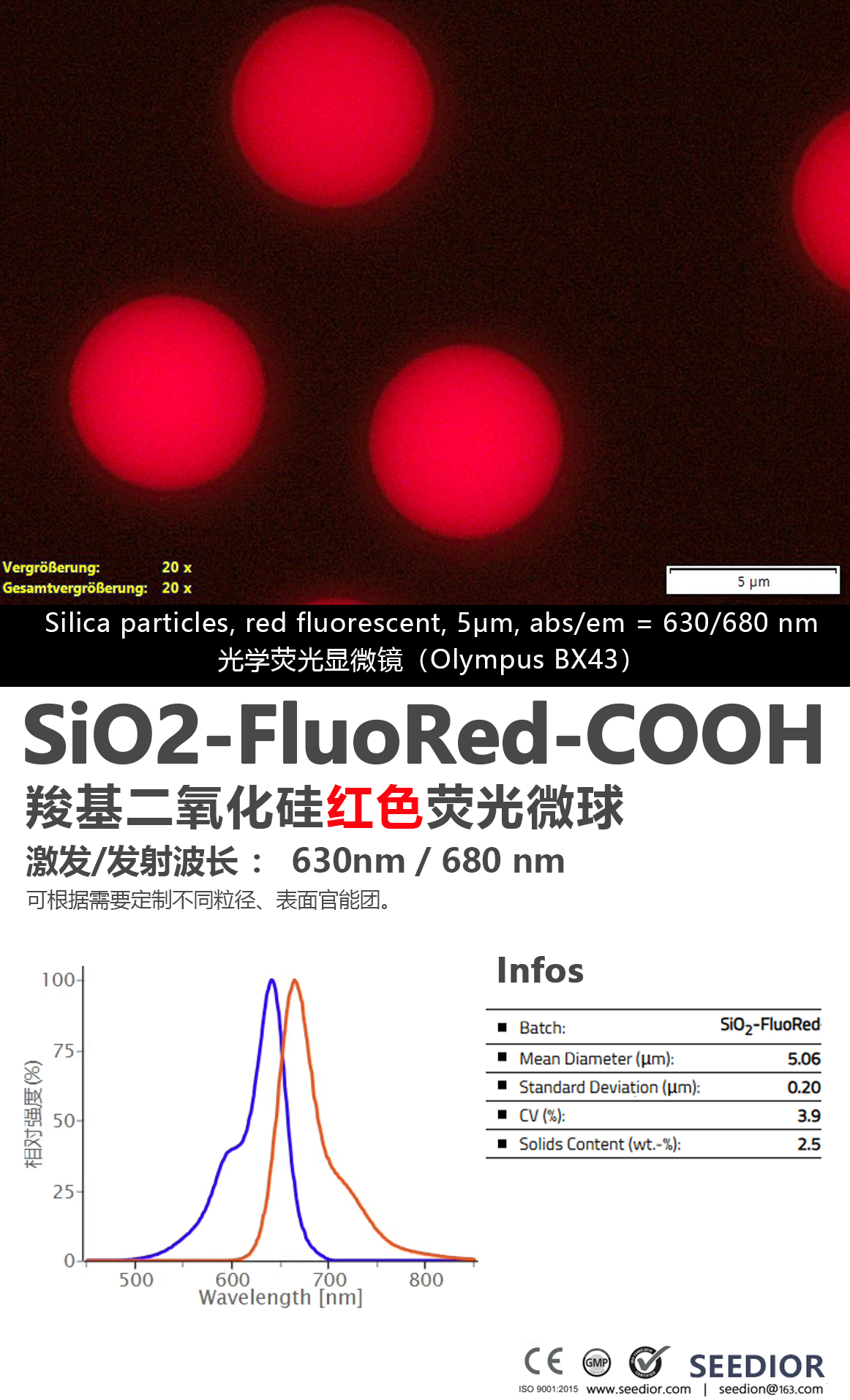 纯度: 2.5%w/v(25mg/ml)水悬浮液,实心无孔,严格正球形品控,单分散粒径(CV < 5 %),密度: 1.85 g/cm3。染料均匀掺入微球内部而不会浸出、溶胀收缩,在有机溶剂、水和生物介质中稳定。微球具有高强度、亮荧光、光热稳定性。激发 / 发射波长: 630nm 和 680nm。【研究与应用方向】:1.生物医学研发、荧光显微测定,生物化学传感,凝集反应测定。 2.生物成像:ELISA免疫分析,负载荧光分子或磁性纳米粒子,细胞追踪成像,对细胞内生化过程实时监测。 3.诊断试剂:检测标志物,光动力 / 光热治疗平台(PDT/PTT)。