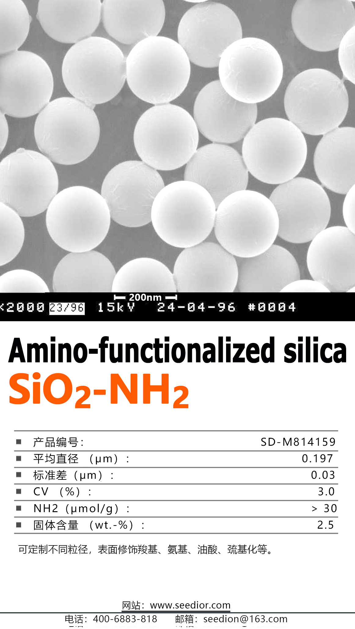 纯度: 2.5% w/v 悬浮液; 实心无孔,非晶致密结构,密度:~1.85g/cm3,正球形品控、表面光滑、粒径均一(CV<3%)。表面修饰官能团:-NH₂,具有正电性,可通过共价键合进一步功能化。【研究与应用方向】: 固相载体,通过氨基固定抗体、抗原、核酸,构建免疫层析试纸条、生物传感器等,进行高灵敏度检测;吸附或共价连接负载药物分子、蛋白质、核酸RNA/DNA、凝集素等,利用氨基进行靶向修饰,药物与基因递送,细胞成像与追踪;生物分子分离、纯化与富集;细胞标记与成像;尺寸排阻色谱固定相。