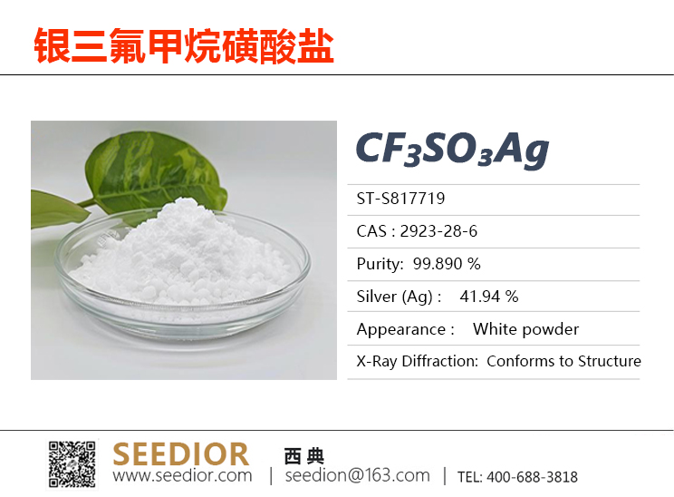 纯度: 99.85+%,CF₃SO₃Ag是一种由Ag阳离子和OTf阴离子组成的化合物, 具有光敏性和吸湿性,可溶于水和大多数有机溶剂。三氟甲烷银是一种配位较弱的阴离子, OTf离子可作为配体与Ag+配位;可用于促进亲电鏻盐的形成、傅-克反应、亲核烯烃环化反应以及酯化反应,可在温和条件下实现醇与一级烷基卤化物的醚化反应。【研究与应用方向】:路易斯酸催化剂,卤素提取试剂,药物中间体合成,先进材料制备,传感器和电池研发,污染物处理。
