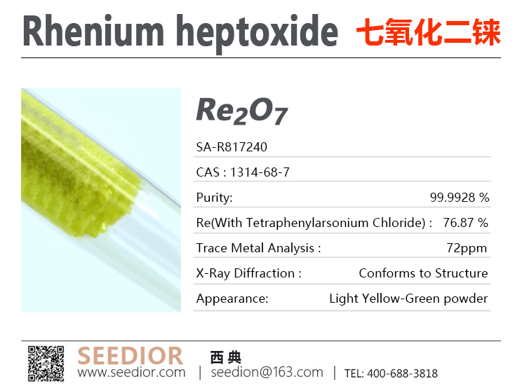 纯度: 99.99+% ,黄色结晶粉末,具有极强的吸湿性、强腐蚀性、绝缘体性质,溶于水生成高铼酸 (HReO₄),在空气中极易吸收水分而潮解,水溶液呈强酸性;加热250℃开始升华,600°C以上直接热离解,不涉及歧化;易被还原剂还原,生成二氧化铼和铼;催化机制与铼的高价态(+7)和可还原性有关。【研究与应用方向】:有机合成高效催化剂,催化剂前驱体,普林斯环化反应,醛烯化反应,烯丙醇、肟和酰胺脱水反应,钼和铼分离,衍生材料研发。