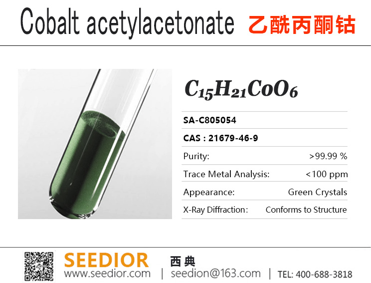 纯度: 99.99+%,绿色结晶粉末,具有高熔点、可控的热分解特性,抗磁性,在有机溶剂中溶解性良好,难溶于水且具有吸湿性。其钴元素具有的多价态催化特性,可调控的热分解特性和高效的电子转移能力。【研究与应用方向】:均相与多相催化;构建光催化CO₂还原和析氢反应体系;气相沉积制备磁性薄膜和电子元件;作为模型配合物研究金属-配体相互作用,合成具有光、磁、催化功能的新型配位化合物。