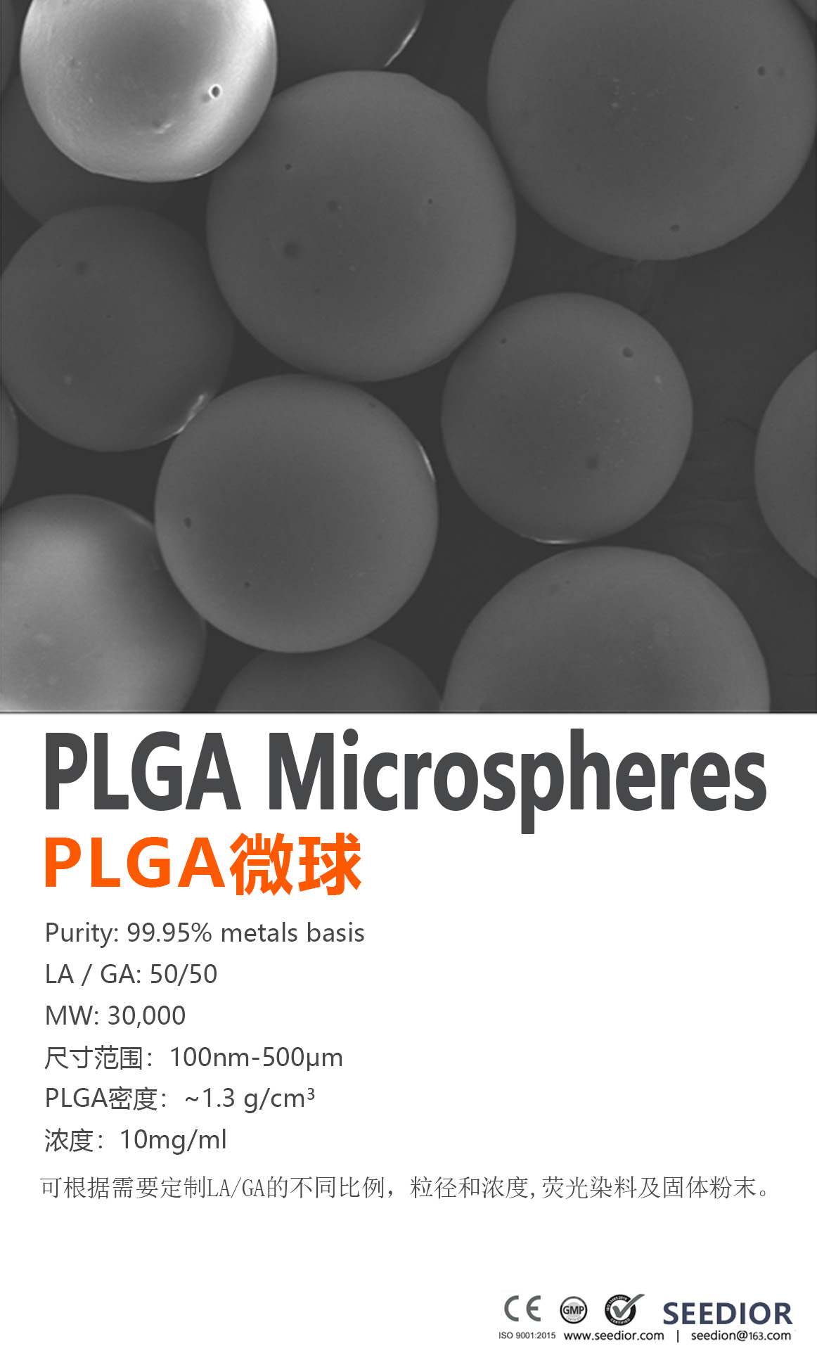 纯度: 99.95%,重金属:≤10μg/g,分散液:10mg/ml。乳化溶剂蒸发法制备。表面光滑、结构致密,LA/GA比例:50/50,非晶无定形,生物相容性好,易渗透,降解快,适用于药物短期控释,蛋白质、肽、抗体和抗原共价结合。降解速度由单体比例调控,单体占比调高,则结晶度上升,亲水性减弱,降解速率下降,适用于激素、抗癌等药物长效缓释(1-4个月)。【研究与应用方向】:分子封装吸附,药物中短期控释,疫苗佐剂、抗原、蛋白、多肽类药物递送,靶向给药,超声或磁共振成像微泡、造影剂载体,API,医学研究。