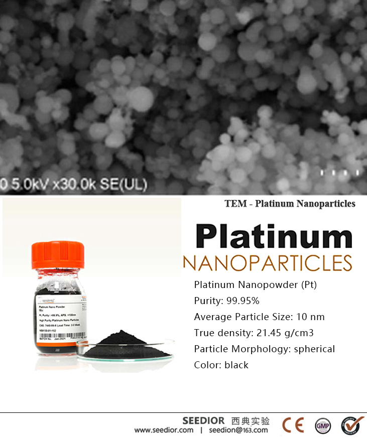 纯度: 99.95+% metals basis, 采用等离子体雾化法制备,黑色粉末,球形。耐腐蚀,耐高温,导电性能佳,抗菌。比表面积大,对氢气、氧气有强吸附力,具有极高的催化活性和吸附力。【研究与应用方向】:铂黑电极,电化学微传感器、电导率检测电极,阴极射线管,铂电阻温度传感器;氢化、脱氢、氧化多相催化剂,电解水制氢,电池电极催化剂、气体净化;生物检测传感,改良神经刺激电极,PtNPs的酶活性试剂,抑制DNA损伤和细菌毒性研究。