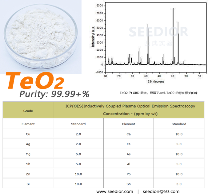 纯度: 99.99+% metals basis;一种两性物质,其与酸反应生成碲盐,与碱反应生成亚碲酸盐。【研究与应用】:二氧化碲制成的玻璃具有高折射率,并透射到中红外区域,用于光波导和光纤放大。催化剂、红外线装置、用于可以将光转换为声音的设备(声光材料)、冷却元件、压电晶体、发射光谱分析、也用于疫苗的细菌测试,检测碲酸盐疫苗制备中的细菌。