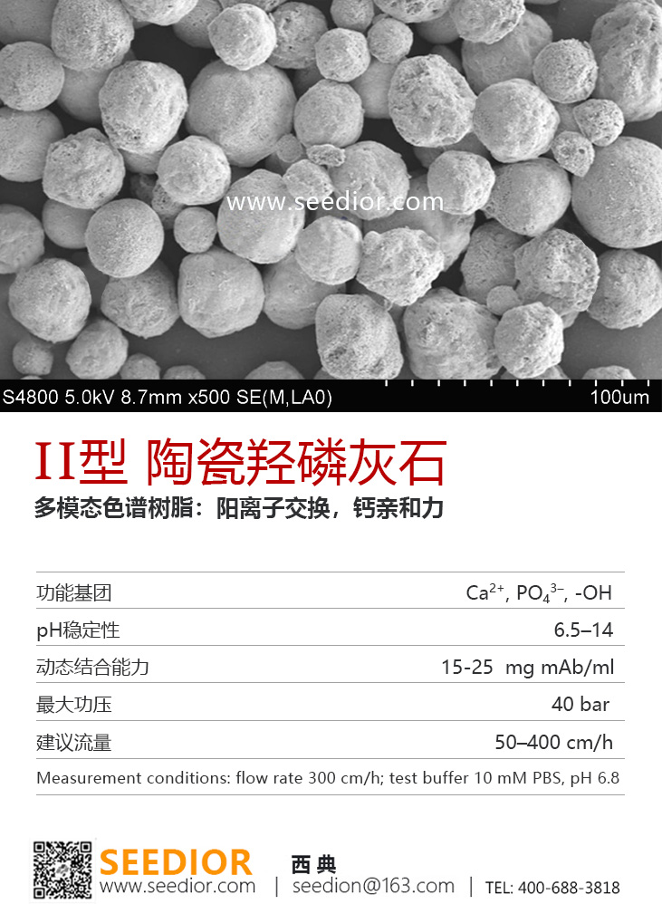 纯度: 98.5+%,复合模式层析介质,在 700°C 下烧结成型的多孔陶瓷微球,表面同时富含带正电的钙离子(Ca²⁺) 位点和带负电的磷酸根(PO₄³⁻) 位点,与生物分子之间存在多种相互作用模式,可以通过钙离子捕获目的蛋白,也可以通过磷酸根去捕获带正电的基团。II型陶瓷羟磷灰石孔径较大(50-70 nm),更适合于IgM、病毒、VLP、质粒等生物分子(>400KD)的纯化。【研究与应用方向】:分离与纯化:抗体、疫苗(如细菌多糖、肺炎球菌多糖和病毒)、核酸、酶和重组蛋白。