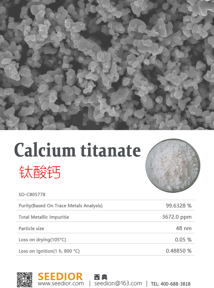 纯度: 99.5+% metals basis,CaO/TiO2(摩尔比): 1.000±0.01;类白色粉末,立方晶系,钙钛矿结构,密度:4.1 g/mL,相对介电常数为140 ~ 150,介电常数的温度系数为(-1000 ~-1500)×10-6/°C,介电损耗角切线小于6×10-4(20°C,1MC)。【研究与应用方向】:高熵巨介电陶瓷,高频仪器导电元件,陶瓷电容器、PTC热敏电阻、微波介质器件,光催化与废水处理,生物医学科研。