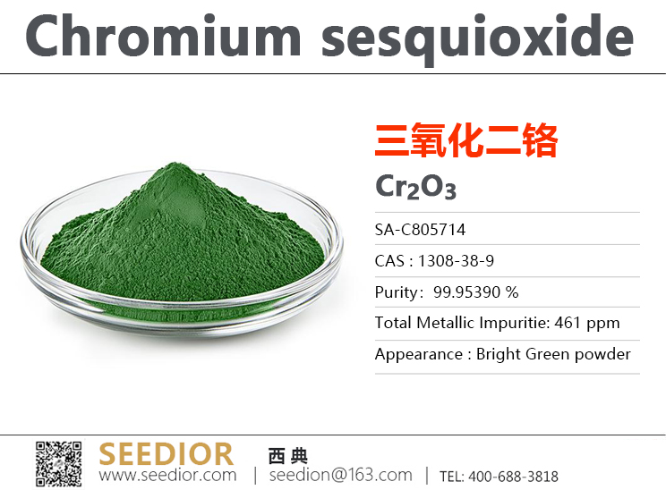 纯度: 99.95% metals basis,鲜艳绿色结晶粉末,六方晶系。有磁性 , 密度:5.21 - 5.22 g/cm³ 。Cr₂O₃凭借其着色力强、遮盖力好、超高稳定性、晶体硬度,已成为颜料、冶金、耐火材料领域的经典无机材料;在纳米化、电化学传感及三元催化氧化物等前沿方向展现出重要价值。【应用方向】:冶金,颜料/涂料,着色玻璃,磨料/抛光,折光材料,耐火材料,催化剂。