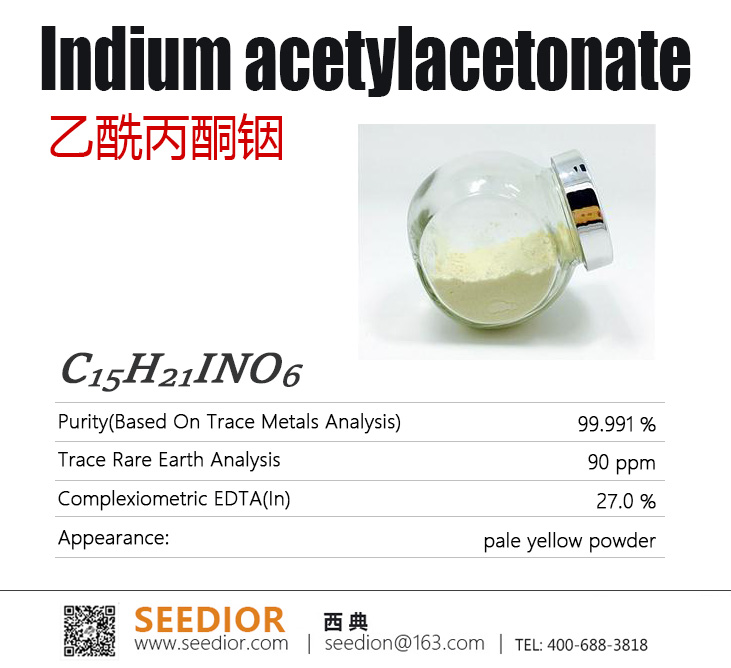 纯度: 99.99% trace metals basis,浅黄色粉末,密度:1.41 g/cm³ ,不溶于水,溶于苯、氯仿、丙酮、甲苯、甲醇等有机溶剂 。具有催化活性,是C-C和C-N偶联反应高效催化剂;乙酰丙酮铟在187-189°C熔化,在可控条件下(约260-280°C)稳定挥发并分解,从而将铟元素精确沉积在基底上,非常适合薄膜沉积应用。【研究与应用方向】:挥发性高纯金属铟源,透明导电和半导体薄膜,有机合成催化剂,气体传感器。